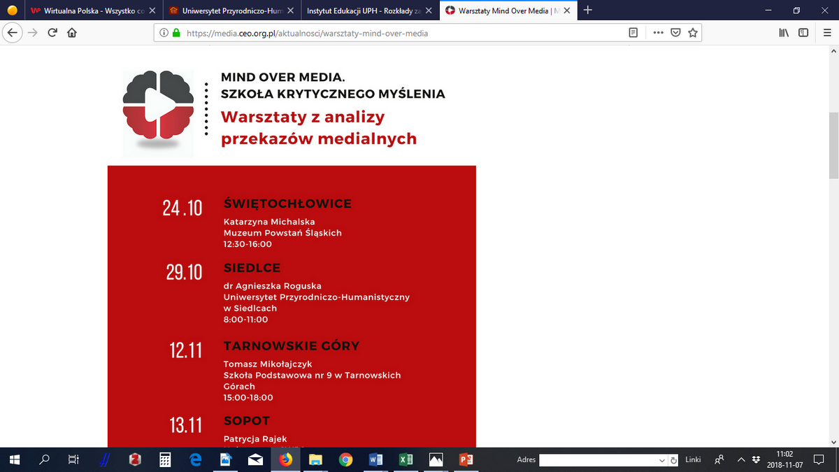 Dnia 29.10.2018 r. na Wydziale Humanistycznym UPH w Siedlcach odbyły się warsztaty Mind Over Media. Szkoła Krytycznego Myślenia. Przygotowanie i prowadzenie: dr Agnieszka Roguska, dr Alicja Antas-Jaszczuk przy współpracy z Kołem Naukowym Pedagogów Kreatywnych. Działania skierowane były przede wszystkim do studentów a ich głównym celem było poznanie narzędzi do analizy i dekonstrukcji przekazów medialnych. Projekt „Mind over Media in EU – Analyzing Contemporary Propaganda” to inicjatywa Fundacji Evens prowadzona we współpracy z partnerami: Stowarzyszeniem Komunikacji i Kultury Medialnej (Chorwacja). Centrum Edukacji Obywatelskiej (Polska),Fińskim Towarzystwem Edukacji Medialnej, MEC / Mediawijs (Belgia), Towarzystwem Mediawise (Rumunia) i organizacją Media Maker/Prasą Obywatelską (Francja). Koncepcję programu opracowała prof. Renee Hobbs z Rhode Island University.
