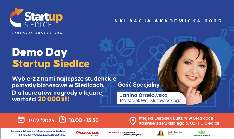 Już 17 grudnia 2025 w Miejskim Ośrodku Kultury w Siedlcach odbędzie się Demo Day – wielki finał programu inkubacyjno-mentoringowego Startup Siedlce. To moment, w którym uczestnicy zaprezentują realne efekty miesięcy pracy, testów, szkoleń i spotkań z mentorami. Gościem specjalnym będzie Marszałek Janina Orzełowska.Podczas finału zobaczysz innowacyjne projekty z pięciu różnych branż: