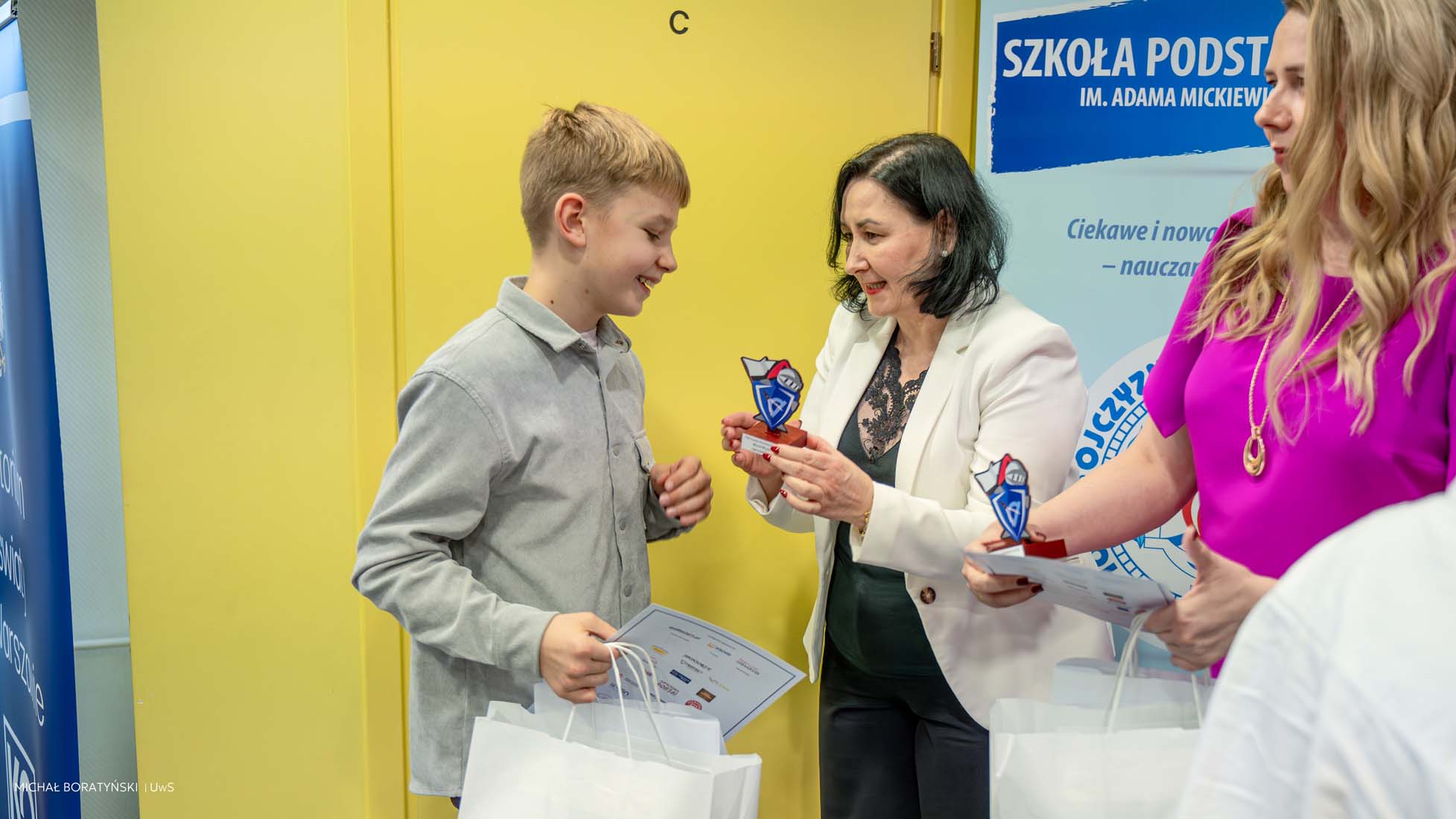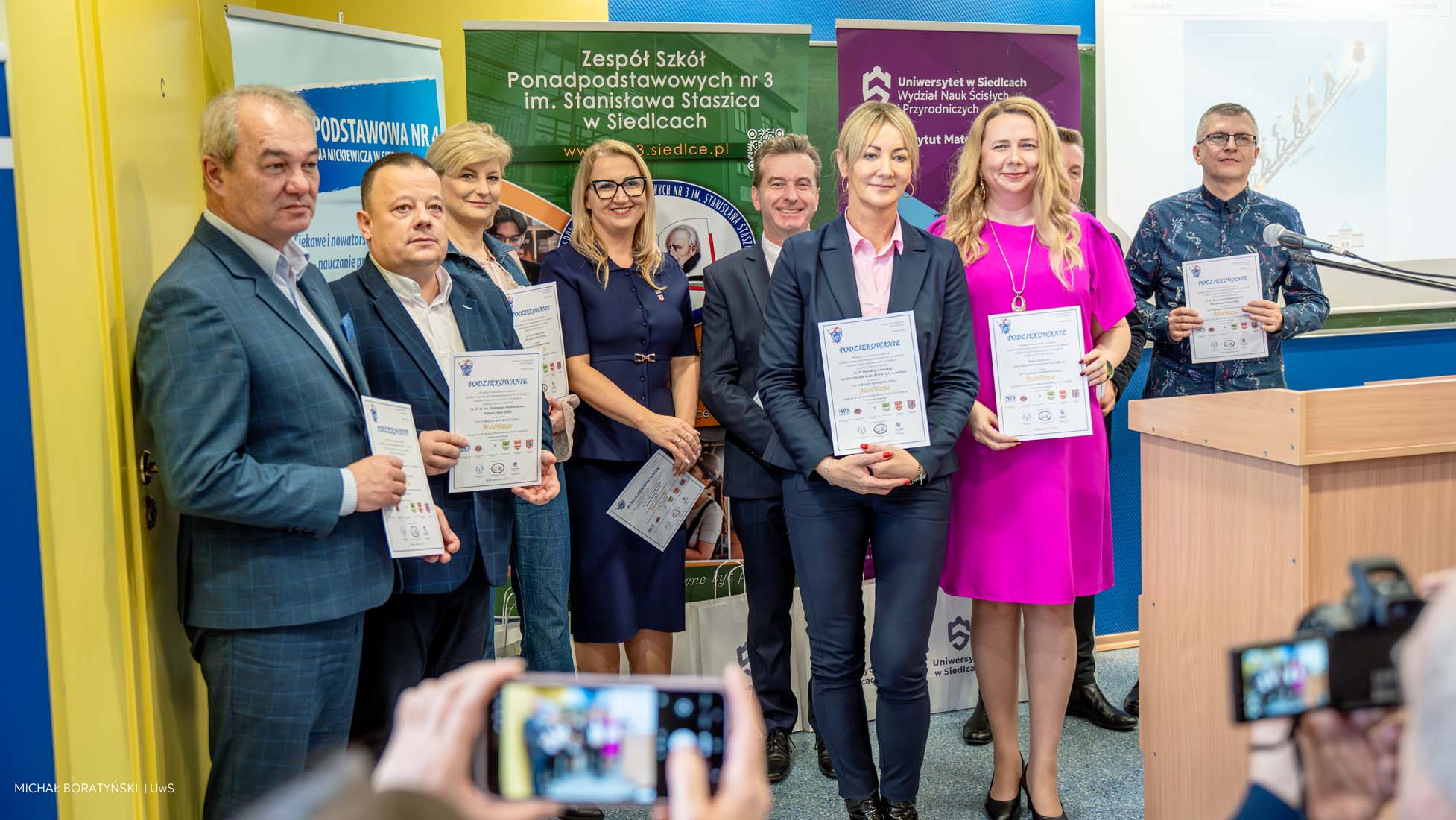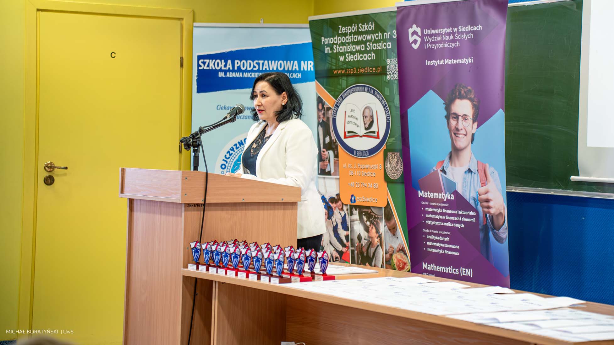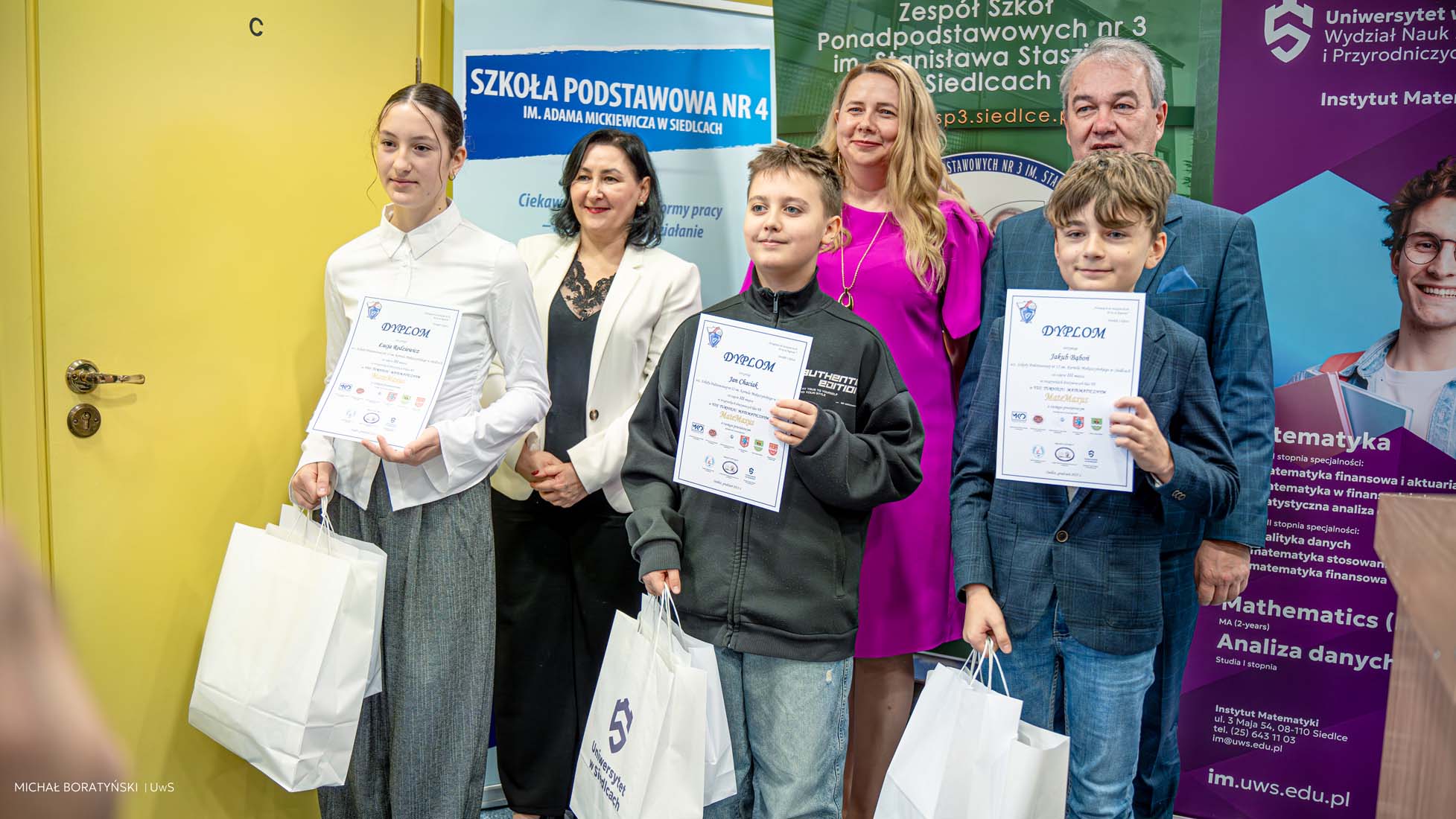 Statuetki, dyplomy, podziękowania oraz nagrody zostały wręczone przez Panią prof. dr hab. Marzenę Stańską Dziekana Wydziału Nauk Ścisłych i Przyrodniczych, Uniwersytetu w Siedlcach, panią Dyrektor Instytutu Matematyki dr hab. Agnieszkę Gil-Świderską, prof. UwS, pana mgr inż. Krzysztofa Grzegorczuka Dyrektora ZSP nr 3, panią Joannę Matysek Dyrektora SP4.
