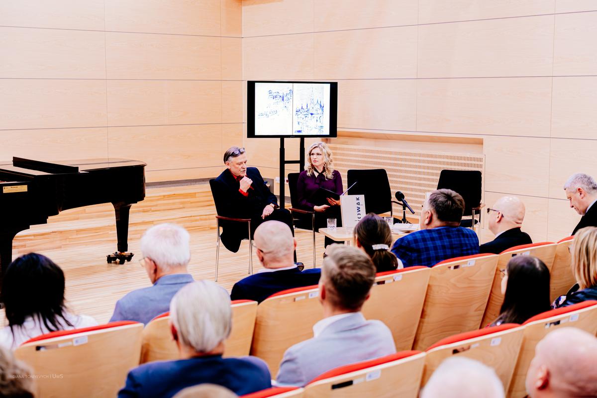 Po otwarciu wystawy zebrani zostali zaproszeni do Sali Koncertowej na rozmowę promującą książkę Tomasza Nowaka „Kanon / blask / gest”. Rozmowę z autorem prowadziła dr Aldona Borkowska, dyrektor Wydawnictwa Naukowego UwS. Album powstał przy okazji majowej wystawy malarstwa artysty w Muzeum Archidiecezjalnym Kardynała Karola Wojtyły w Krakowie. Publikacja prezentuje impresje na temat sztuki nowoczesnej oraz artysty we współczesnym świecie. Mamy tu do czynienia, jak pisze autor „z zapisem autorskiego dialogu nawiązującego do sacrum i profanum, wartości budujących sferę religijną, ale także niekonwencjonalną metodę odczytywania współzależnych zjawisk tworzących naszą kulturę, a w tym sztukę”. Koncepcją graficzną albumu zajął się dr Mariusz Filipowicz z Akademii Sztuk Pięknych w Warszawie oraz Wydziału Sztuki Uniwersytetu w Siedlcach.